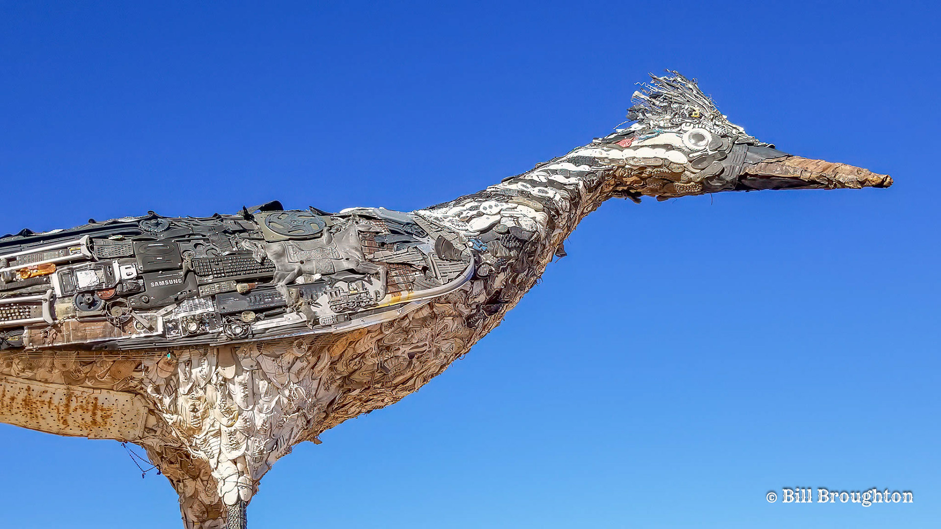 The giant roadrunner sculpture on Interstate 10 near Las Cruces, New Mexico, is an eye-catching landmark that has intrigued travelers for decades. Created by artist Olin Calk in 1993, this massive sculpture stands approximately 20 feet tall and 40 feet long, perched on a hill overlooking a rest area west of Las Cruces. What makes it particularly unique is that it is constructed entirely from recycled materials, including old metal, discarded shoes, and even broken electronics. The sculpture not only serves as a striking roadside attraction but also conveys a message about sustainability and creative reuse. Over the years, it has become a beloved symbol of the region, celebrating both the roadrunner—New Mexico’s state bird—and the importance of environmental consciousness.